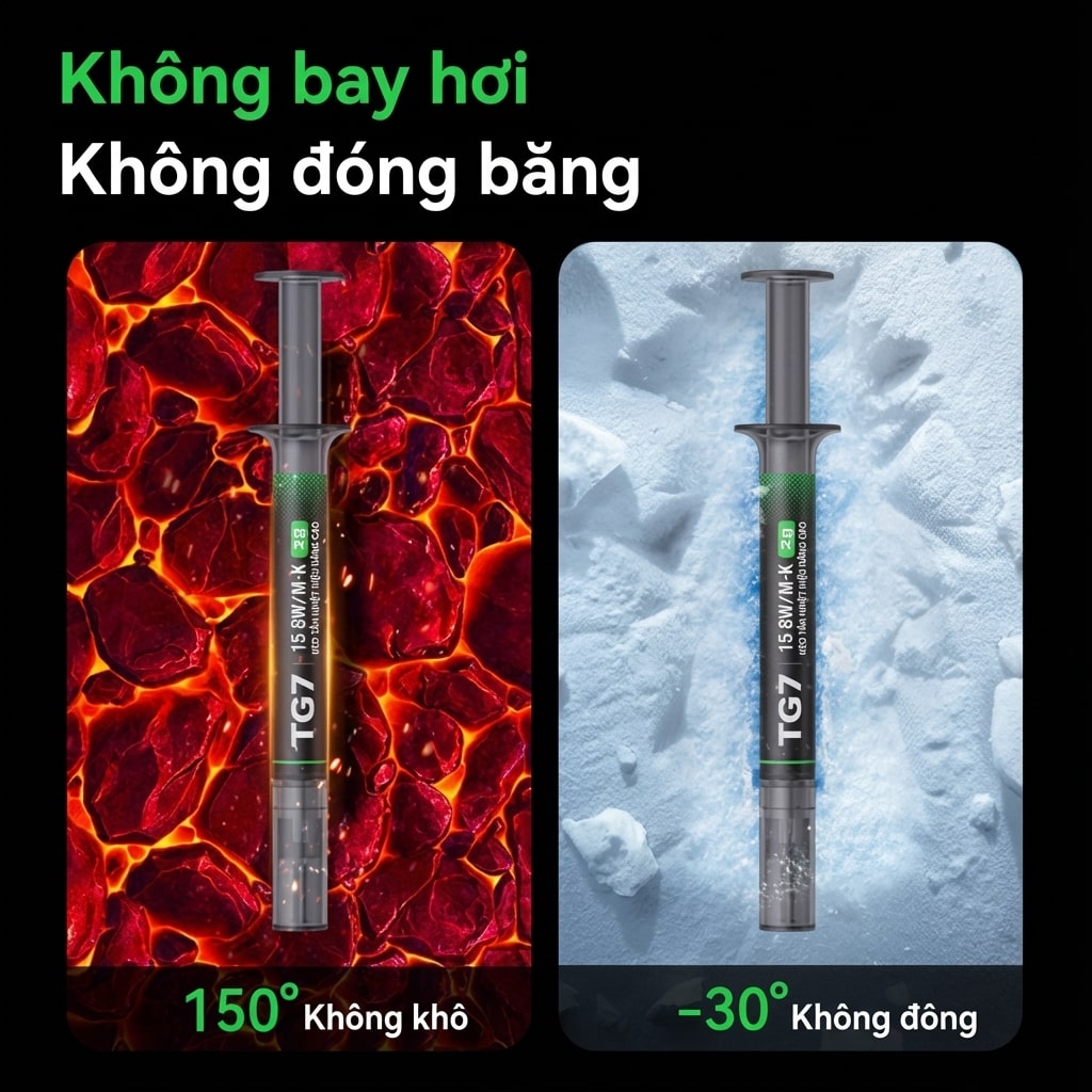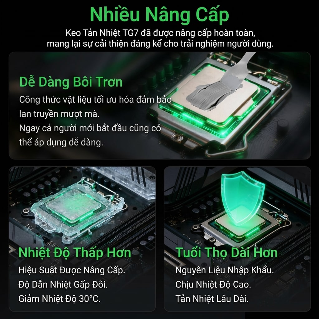 - Kem tản nhiệt TG7 là loại keo tản nhiệt được phát triển bởi Iceman Snowman Thermal Flow Simulation Lab dành cho các tính đồ đam mê overlock, game và delid cpu với độ dẫn nhiệt cao, độ nhớt tố và sự bền bỉ với nhiệt độ cao.