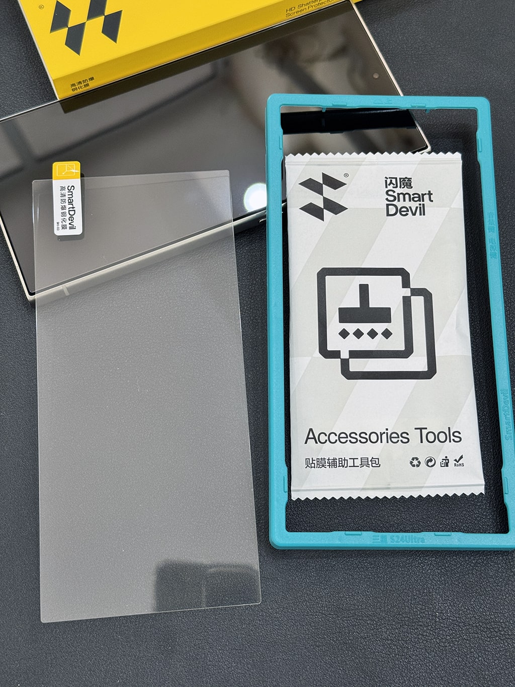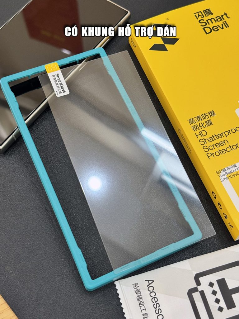 - Cường lực chính hãng Smart Devil (1 hộp full box có 2 miếng kính cường lực, 1 khung hỗ trợ dán).