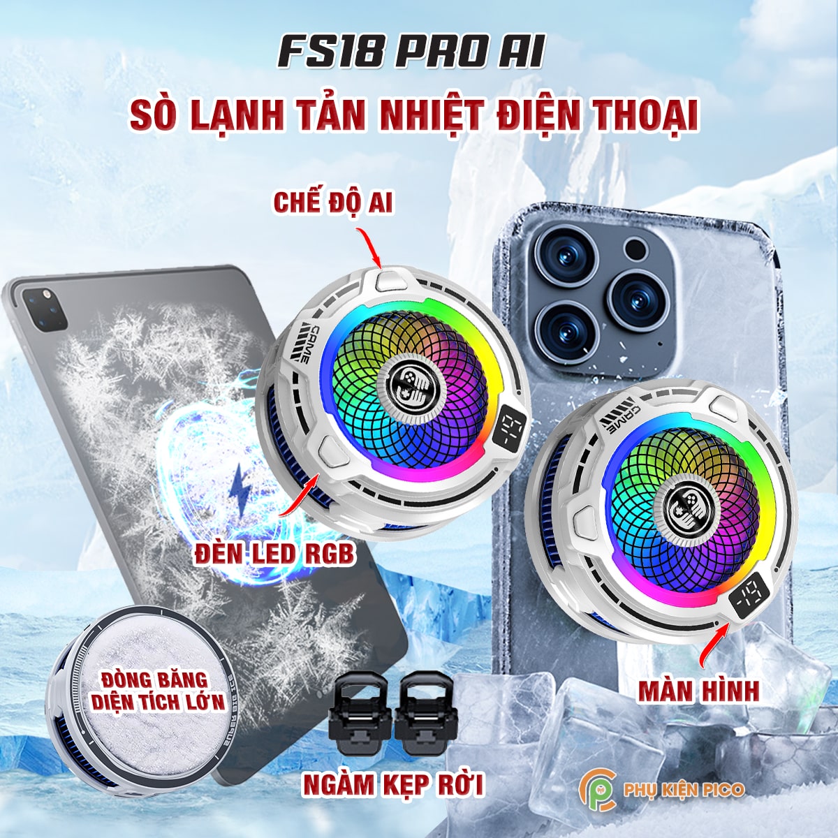 - Sò lạnh tản nhiệt FS18 Pro AI sử dụng cho tất cả các dòng điện thoại, máy tính bảng.