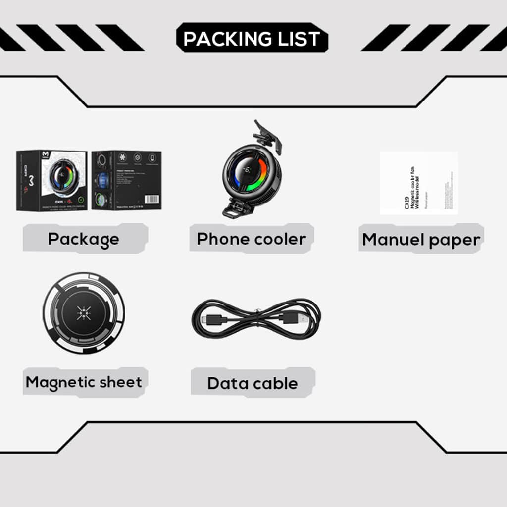 - Bộ sản phẩm gồm có: 1 quạt tản nhiệt + 1 cáp sạc + 1 bộ ngàm + 1 vòng từ tính.
